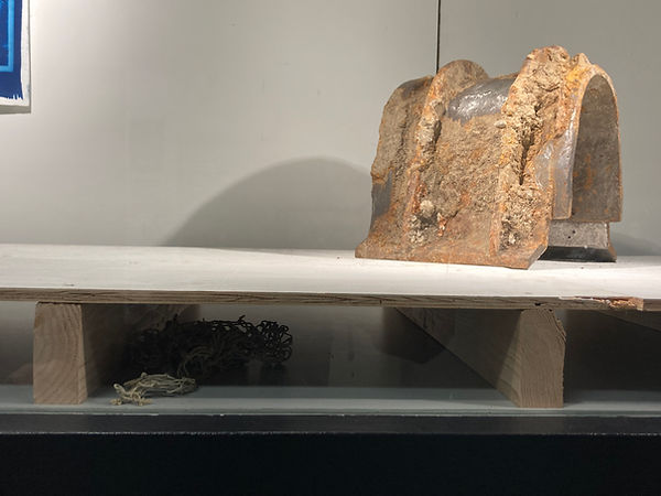 cyanotype on paper, seel, chairs, coral on found netting, magnolia grandiflora petals, beeswax, pine sap, SAE 5w-30 oil, silk, horsehair, seashells, thread, plywood, 2x4s